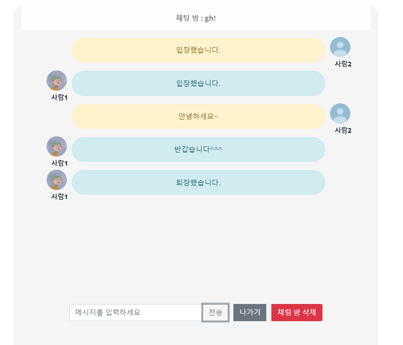 **입장,퇴장 안내 메시지는 공통이므로 클라이언트에서 보내기보다 서버에서 일괄적으로 처리하는게 낫다고 어떤 블로그에서 말했다. 나중에 할 수 있으면 그렇게 리팩토링 해봐야겠다.